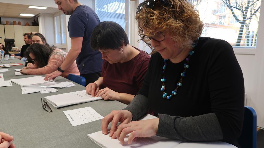 In the first part of the workshop, individuals with deafblindness practiced reading Braille lines. Through various exercises, they developed their ability to recognize Braille characters. The second part of the workshop focused on learning to walk with the white-red cane, which is specifically designed for individuals with deafblindness.
